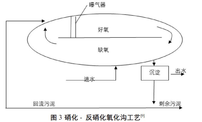 氧化溝工藝自問(wèn)世以來(lái)在全世界范圍內(nèi)得到了廣泛應(yīng)用,目前已成為我國(guó)污水處理的主導(dǎo)工藝之一。氧化溝具有獨(dú)特的構(gòu)造形式(如圖3),無(wú)終端循環(huán)水路,使得曝氣機(jī)產(chǎn)生的溶解氧沿著水流方向產(chǎn)生濃度梯度,并周而復(fù)始地發(fā)生變化,從而使得氧化溝在去除有機(jī)物的同時(shí)對(duì)混合液中的氮、磷也具有良好的去除效果。