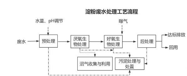 從總體上看,對淀粉廢水的治理宜采用“預(yù)處理+厭氧生物處理+好氧生物處理+深度處理”的污染治理工藝,工藝流程圖如下: